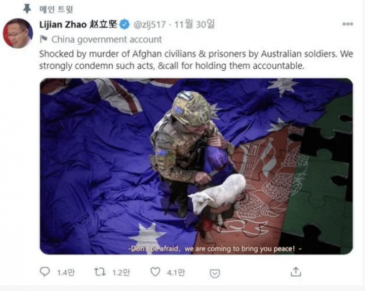 중국 외교부 대변인이 호주군의 아프가니스탄 민간인 포로 살해를 비판하면서 호주군이 아프간 어린이의 목을 베는 것처럼 묘사된 합성 사진을 올린 사건이 중국과 호주의 갈등을 넘어 국제적 외교 문제와 비화할 조짐을 보이고 있다.
