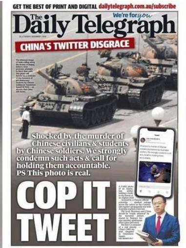 호주 언론 합성 따윈 하지 않고, 합성이 필요 없는 이미지로 천안문 민주화 시위의 상징 탱크맨을 등장시킨다.