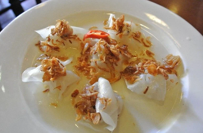 쫄깃한 흰색 피 안에 돼지고기와 새우가 들어 있는 베트남식 물만두.