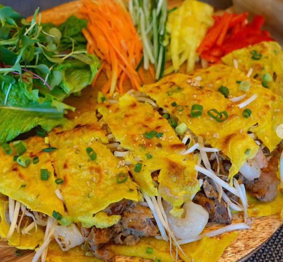 쌀가루 반죽을 얇게 튀긴 후 고기, 새우, 숙주나물, 양파 등을 넣어 익힌 음식으로, 우리나라의 부침개와 비슷하다.